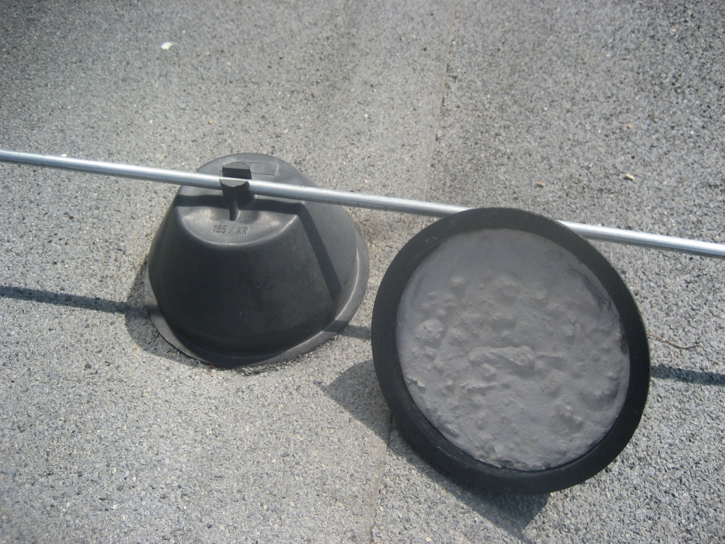 Пластиковый держатель заполнен бетоном вручную.Бюджетный вариант держателей круглого проводника на мягкой кровле без уклонов.