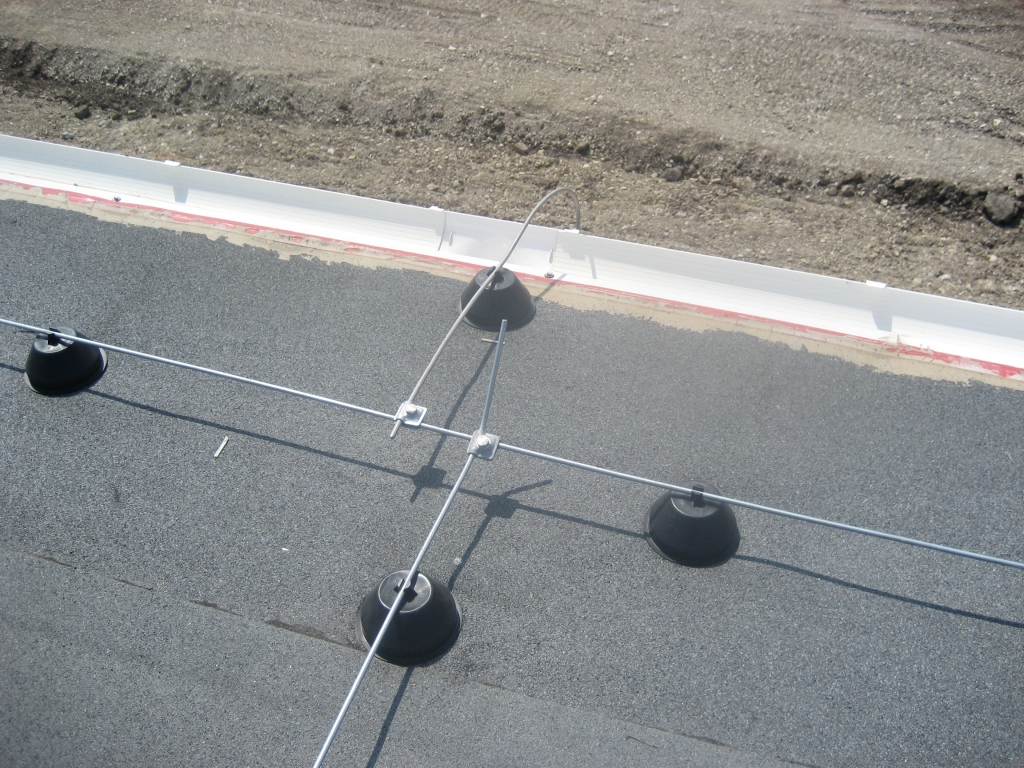 Бюджетный вариант держателей круглого проводника на мягкой кровле без уклонов.